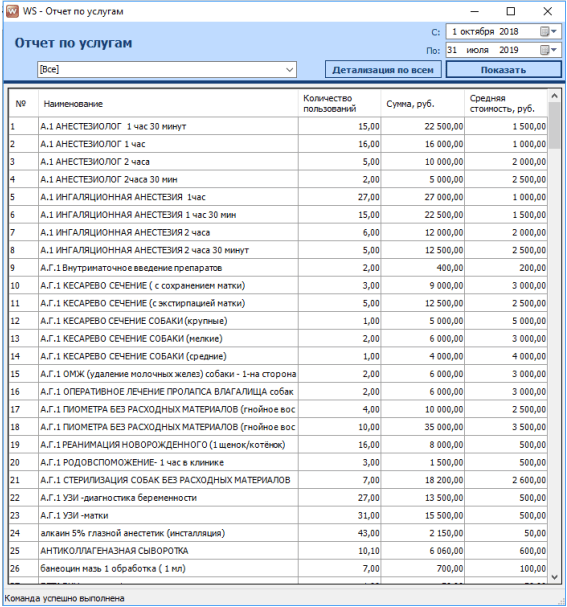 В программе можно создавать списки владельцев, врачей, животных, лекарств, и услуг; вести учёт лекарств, а также формировать отчёты как по движению лекарств, так и по услугам.