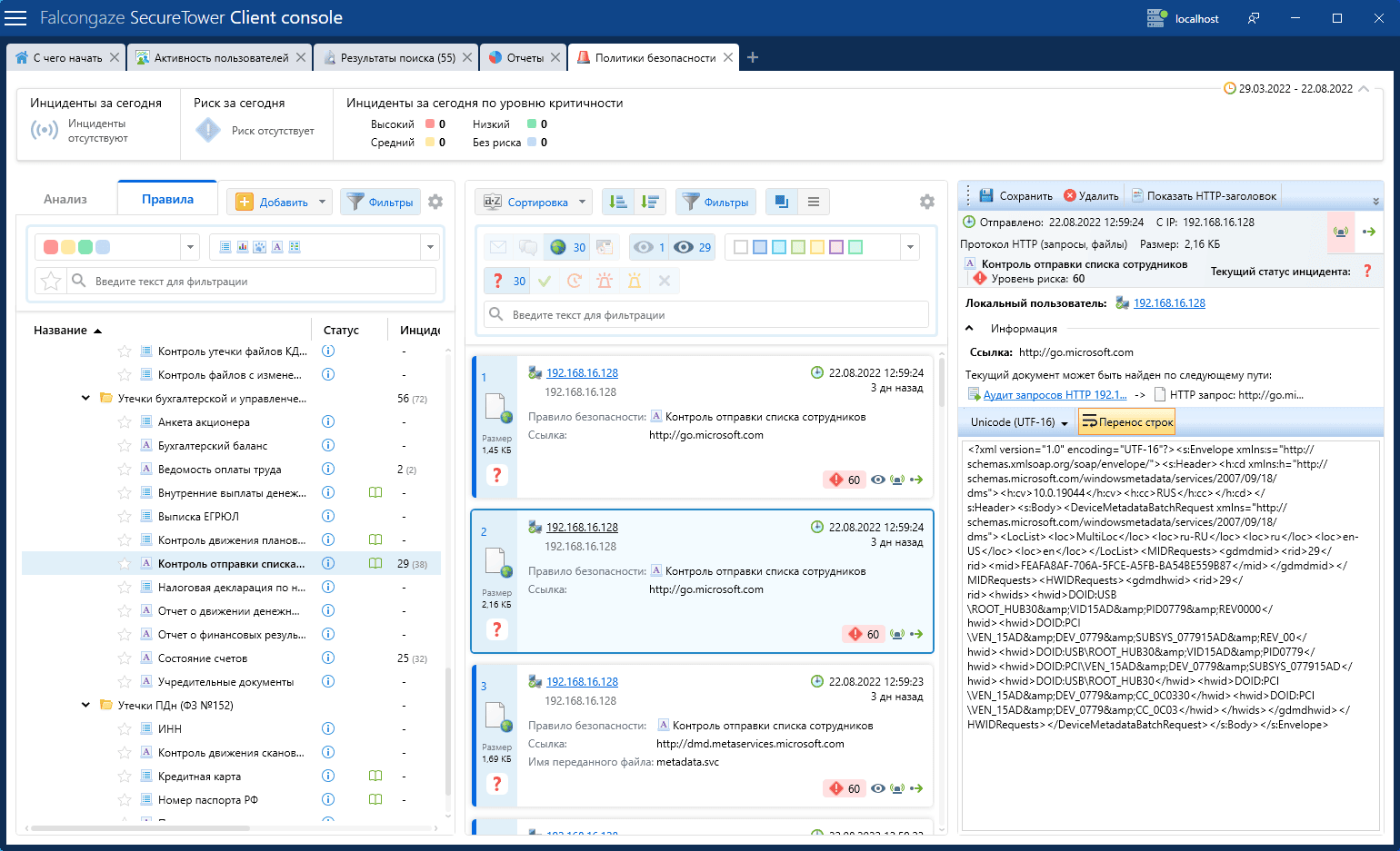 SecureTower используют более 1000 компаний по всей России. Понятный интерфейс, низкие требования к серверу, быстрота внедрения, обучение и помощь в поиске утечек информации – в DLP Falcongaze SecureTower.