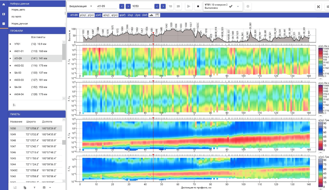 Функционал включает в себя загрузку данных МТЗ, визуализацию входных данных в виде карт, разрезов, графиков, поворот данных, коррекцию статистического сдвига амплитудных кривых МТЗ, автоматическую 1D инверсию и ручной подбор модели, автоматическую 2D инверсию, а также экспорт данных и результатов."