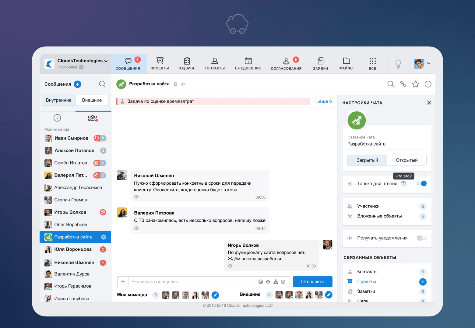 Сервис позволяет объединить сотрудников компании в удобном чате, где можно за пару кликов мыши найти нужный диалог и быстро решить вопрос. А каждый объект (контакт, проект и пр.) связан с диалогом, куда подключаются участники. И даже более того, Smarty Workplace позволяет создавать внешние чаты и подключать туда партнёров. Таким образом, мы переходим на уровень общения организаций, а не отдельных сотрудников.