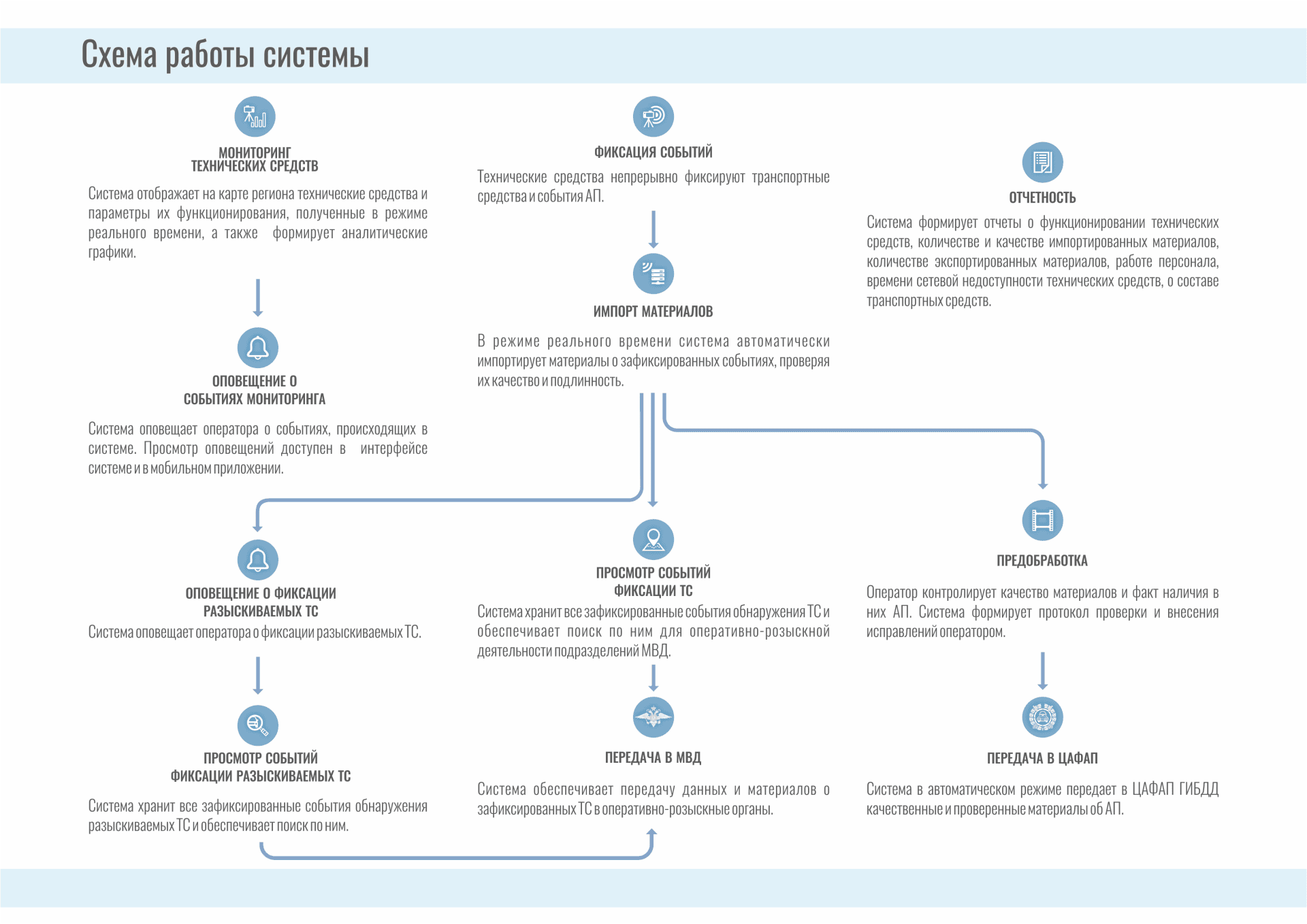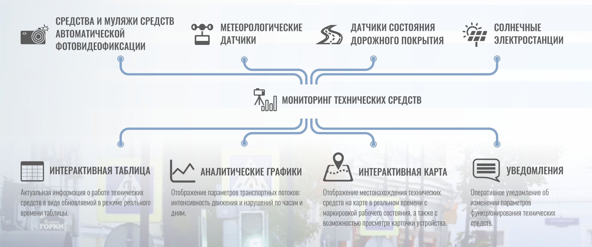 7) просматривать графики со статистикой фиксаций, напряжения, доступности, осуществлять мониторинг датчиков дороги и погоды; выводить все данные на карту вашего региона; оповещать пользователей (в том числе в мобильном приложении - Android, IOS).