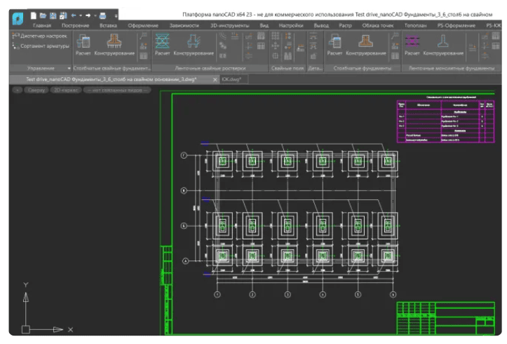 Ключевые возможности: подготовка рабочих чертежей марок КЖ и КЖИ, подготовка схем расположения и чертежей столбчатых фундаментов на свайном и естественном основании.