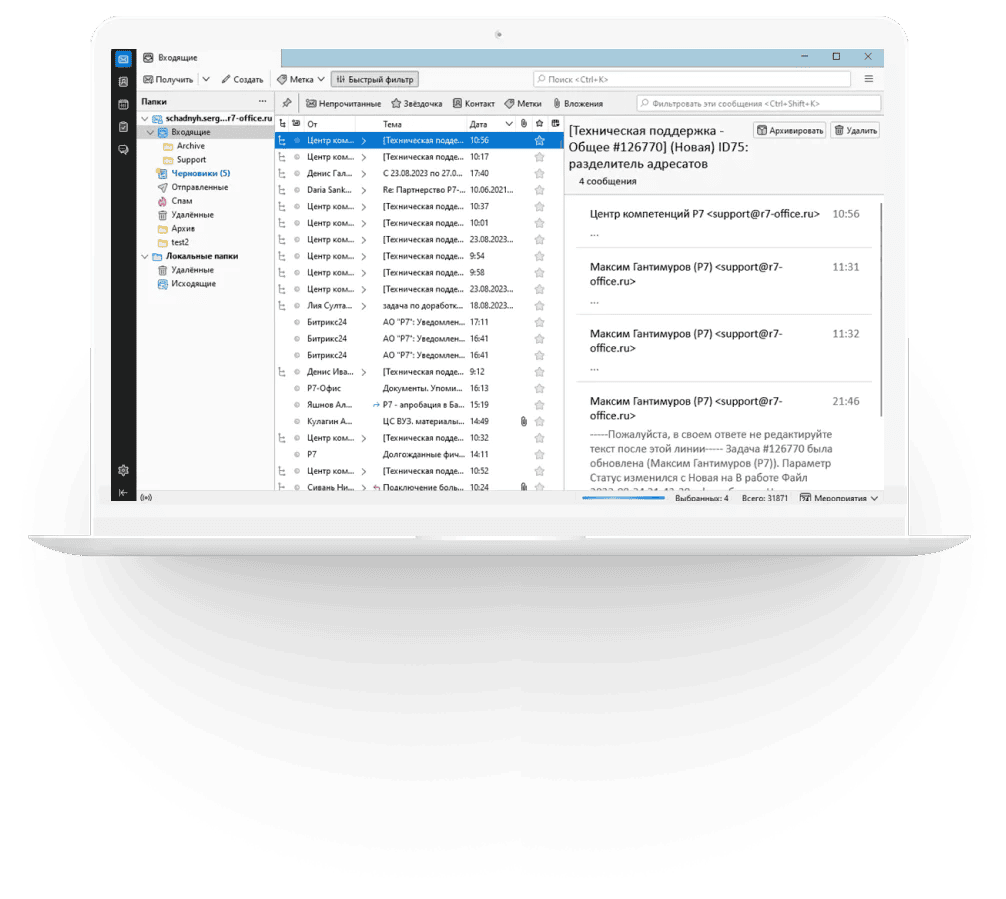 - Без ручного вмешательства осуществляется подключение и обновление почтовых ящиков через EWS.