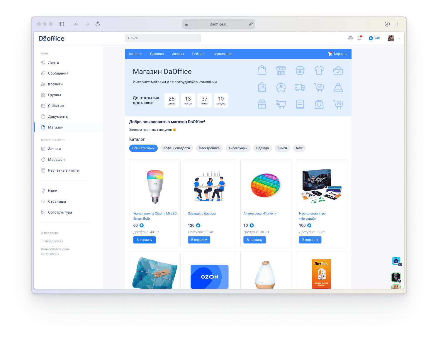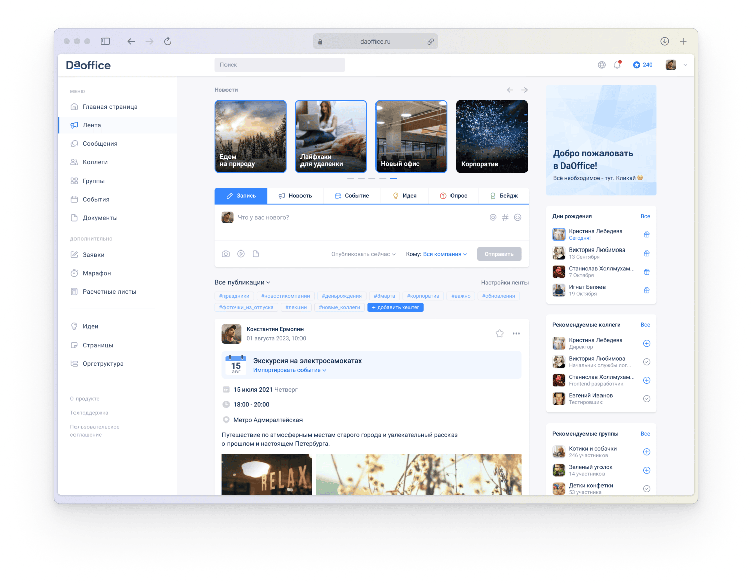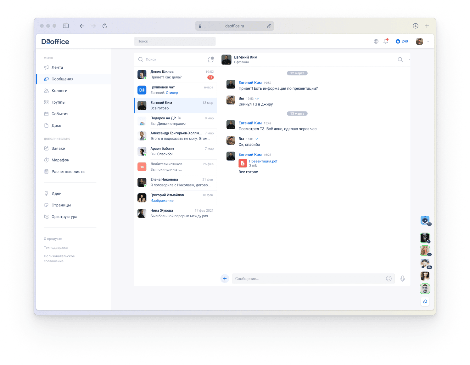 - В собственном корпоративном мессенджере DaOffice можно создавать групповые и личные чаты, обмениваться файлами, делиться ссылками на документы внутри соцсети.
