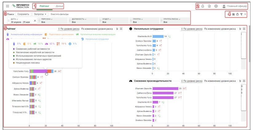 Он формирует рейтинг подозрительного поведения сотрудников с использованием искусственного интеллекта для автоматического определения групп риска на основе моделей поведения.