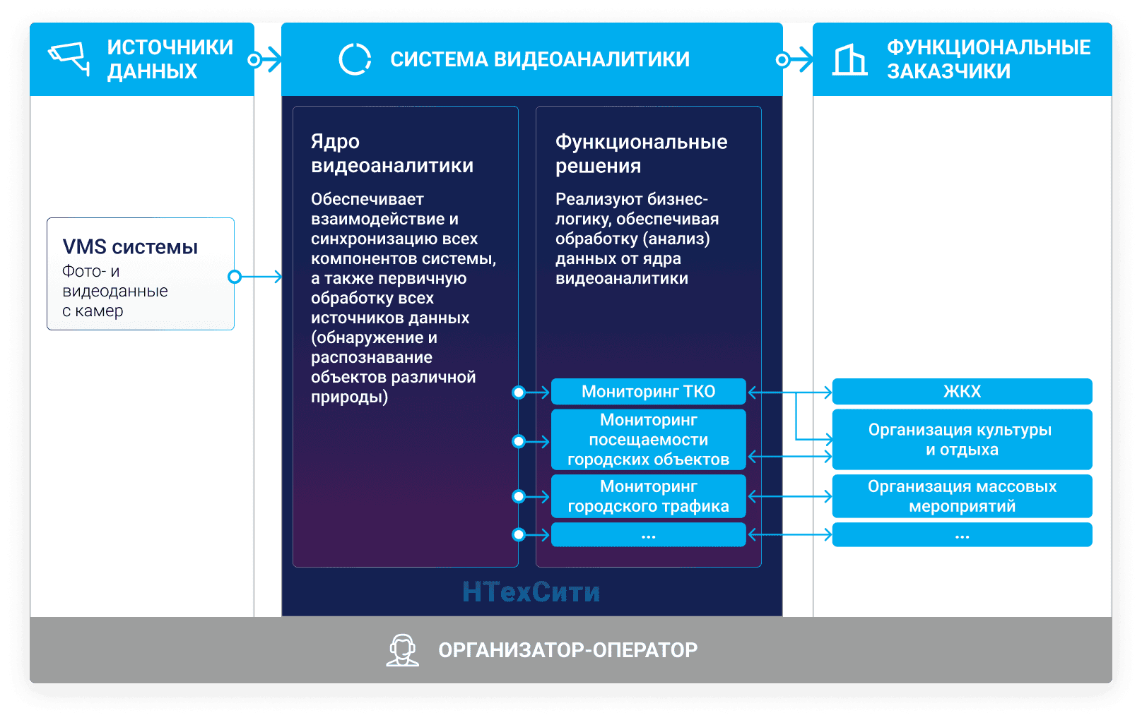 НТехСити - это модульная система для региональных и городских органов власти. Ядро видеоаналитики обрабатывает данные с камер и отвечает за обнаружение и распознавание объектов. Функциональные решения реализуют бизнес-логику и предоставляют нужные данные функциональным заказчикам.