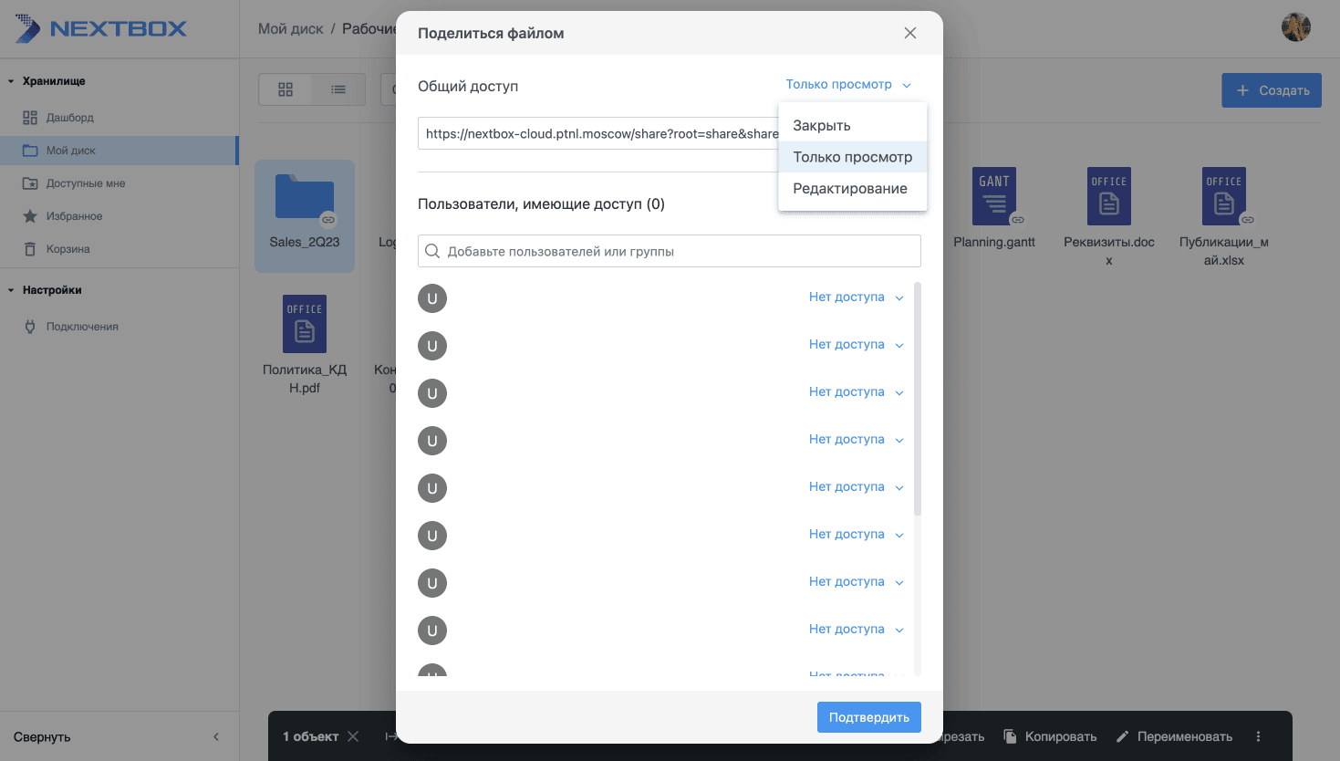 - Шаринг с возможностью ограничения доступа по времени и паролю